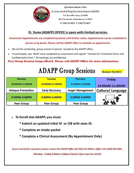 To provide education and treatment to our members. Provide prevention services to youth and promote family unity. Ft. Yuma ADAPP will assist members in their efforts to comply with legal conditions. All services are individualize and ongoing and delivered without judgment or prejudiced assisting individuals to develop and maintain their own recovery program.