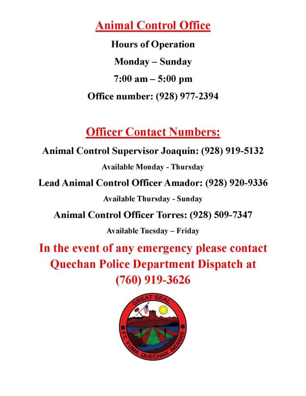 The Quechan Animal Control Office would like to remind all animal owners who live on the Quechan Indian Reservation that they are to comply with the Animal Control Ordinance.