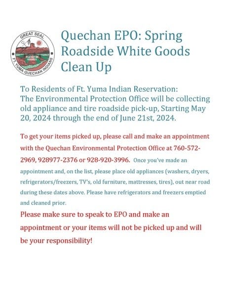 The Environmental Department also known as the Environmental Protection Office, manages federal grants that pertain to environmental quality and habitat restoration/revegetation projects. One of the grants currently being managed are the Environmental Protection Agency’s General Assistance Program; which deals with illegal dump clean up, environmental outreach to San Pasqual Schools and Quechan Elders and Picacho Landfill Closure.