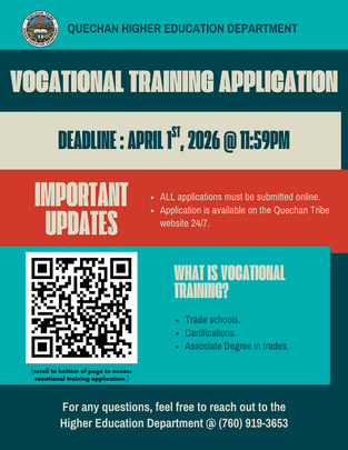 The Quechan Higher Education/Adult Vocational Training Program will provide an application form to be completed by the applicant. A checklist of all required documents will be included with the application. All documents must be submitted on or before the specified deadline date before the application can be forwarded on to the Higher Education Board for their review and consideration. The Higher Education Board is the governing board that recommends scholarship awards to the Quechan Tribal Council.