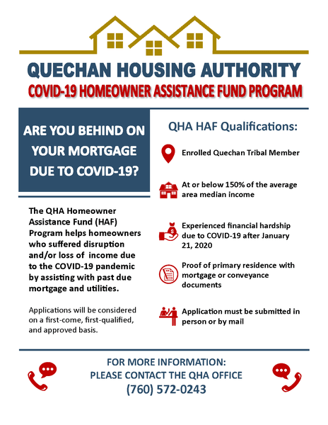 The Quechan Housing Authority was established in 1963 as an organization to administer and manage operations to meet the needs of Quechan families on the Fort Yuma Indian Reservation. QHA manages approximately 200 rental and homeownership units under various programs. Throughout the decades, QHA has expanded their portfolio of funding through the 1937 Housing Act (37 Act), Native American Housing Assistance and Self Determination Act (NAHASDA), Indian Housing Block Grant (IHBG), Tribal Funds, and Low Income Housing Tax Credit Programs.