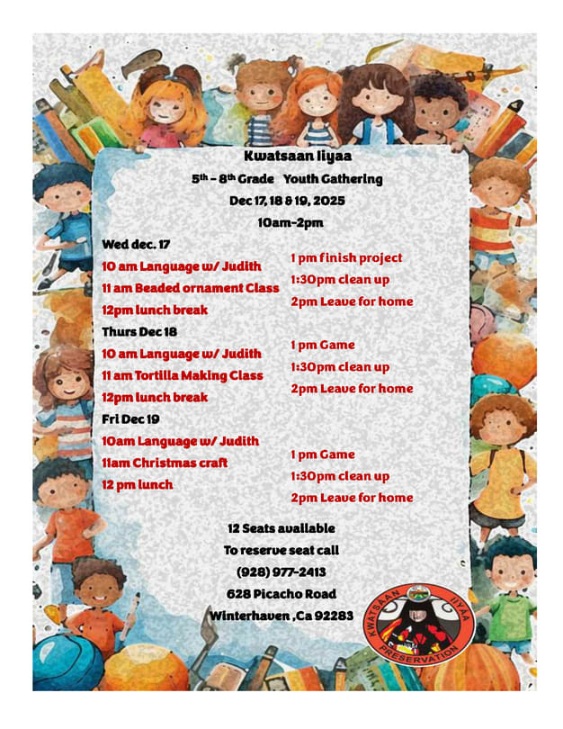 Quechan Language Preservation Program is a community based project, initiated by tribal members. Their wishes in forming a committee were to see a Language Program that would support language and traditional cultural education simultaneously. Language Classes are taught at the old Fort Yuma Indian School on the hill. The instructors go to places such as the Head Start and San Pasqual Schools, Elementary and High Schools, or wherever to teach the Quechan Language.