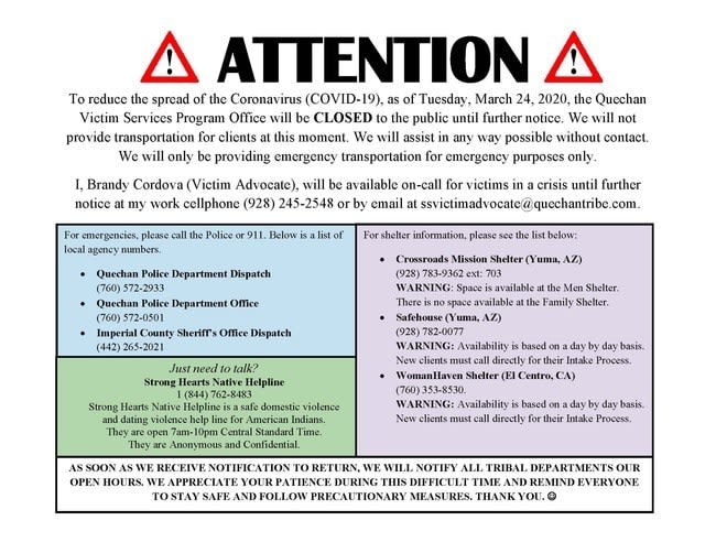 For additional information, please contact Ben DeCorse, Quechan Victim Advocate (760) 572-0201 ext. 205.