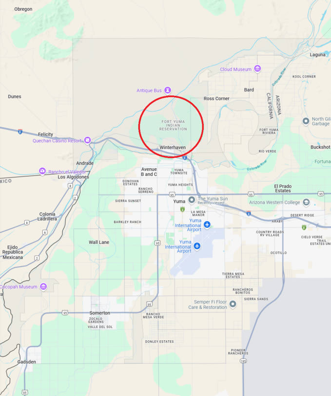 The reservation borders the states of Arizona, California and Baja California, Mexico. Encompassing 45,000 acres, the reservation is bisected on the south by Interstate 8 (I-8). Consequently, several million cars a year drive through the Fort Yuma Quechan Reservation on their way to and from Phoenix and San Diego.