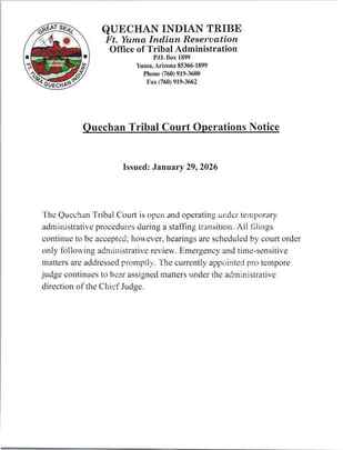 The Quechan Tribal Court is open and operating under temporary administrative procedures during a staffing transition. All filings continue to be accepted; however, hearings are scheduled by court order only following administrative review. Emergency and time-sensitive matters are addressed promptly. The currently appointed pro tempore judge continues to hear assigned matters under the administrative direction of the Chief Judge.